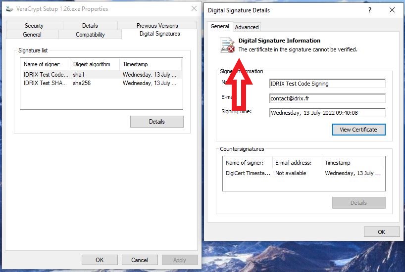 Since you did not use the official VeraCrypt signing certificate to sign your code, but a public development version, you have to import and therefore trust the certificates used.